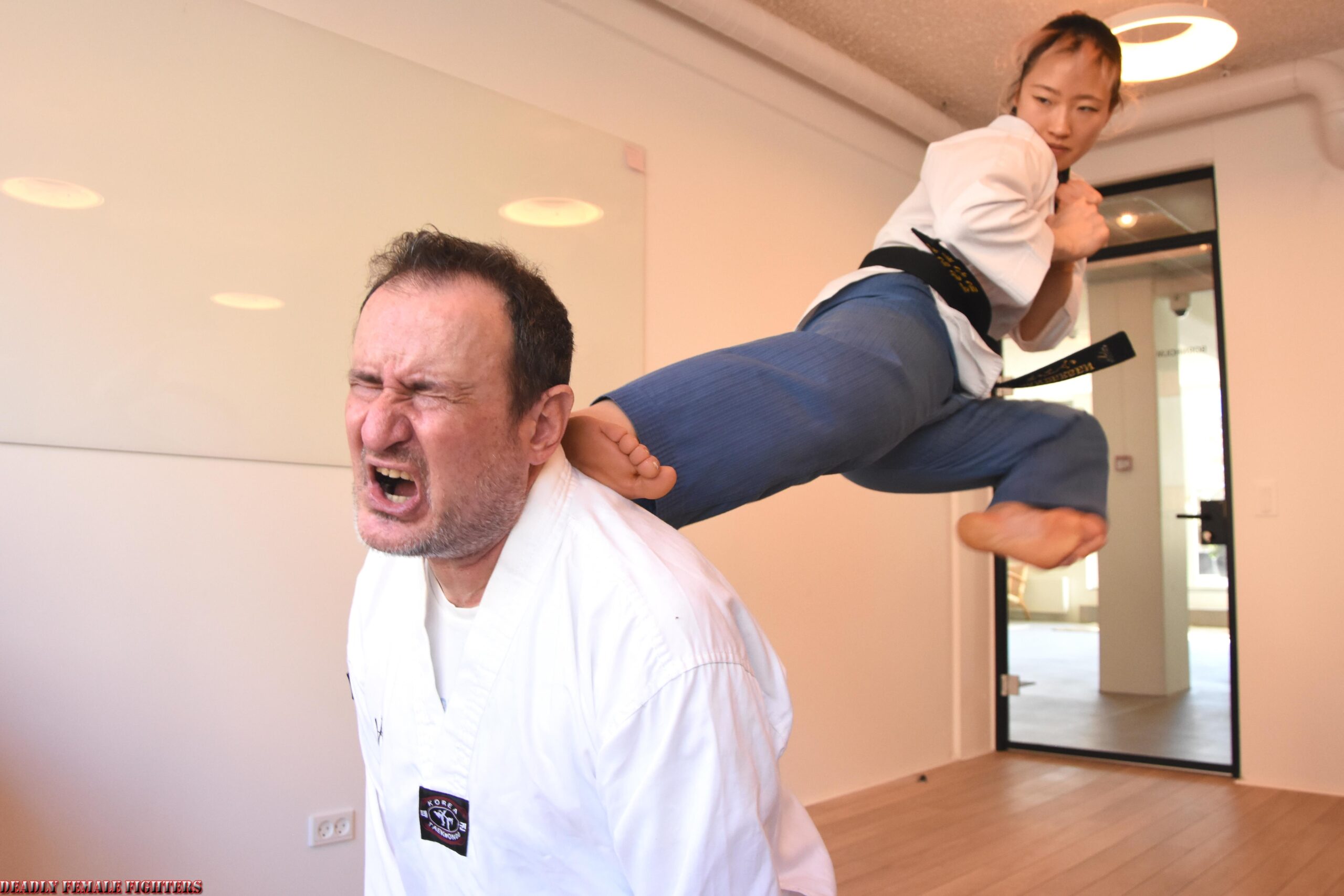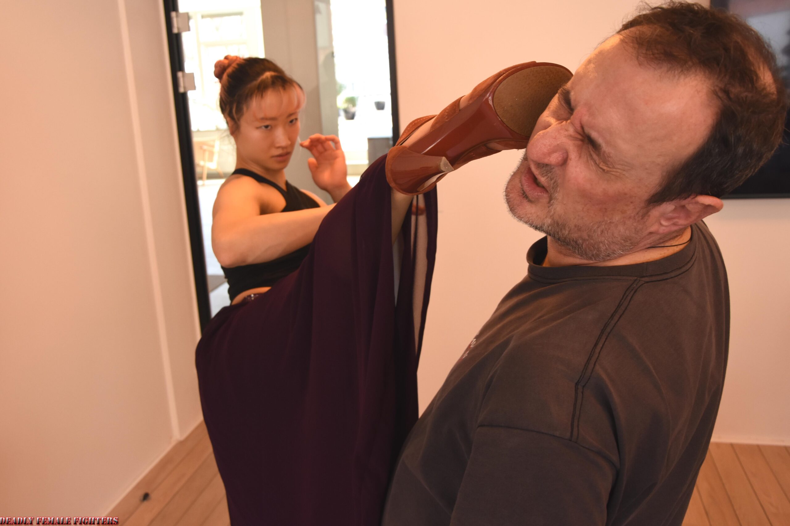 Photoset includes photos in elegant outfit with high heels and in dobok barefoot. Scenario has three scenes, 2 against one opponents and one scene against two. Various deadly techniques, mostly headkicks, punches, groinkicks, splitpunch, flying jumping kick and couple of victory poses.